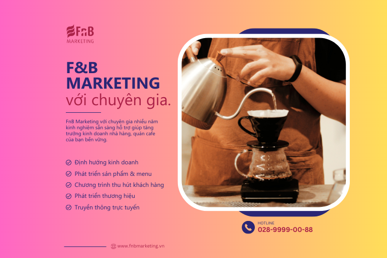 FnB Marketing là đơn vị tư vấn marketing F&B chuyên biệt cho nhà hàng và quán cafe, với đội ngũ chuyên gia F&B có nhiều kinh nghiệm “cải thiện hoạt động kinh doanh” của các dự án kinh doanh F&B thực tế.
